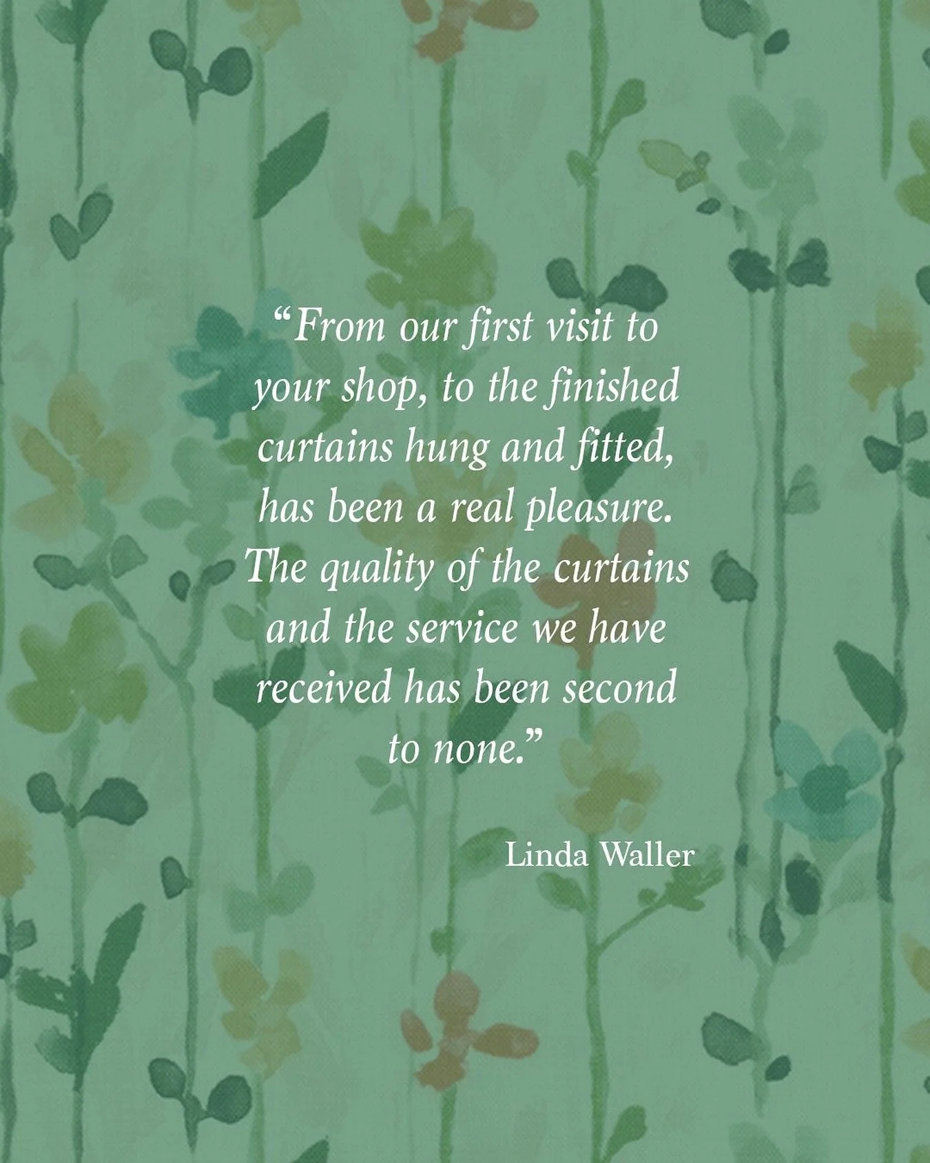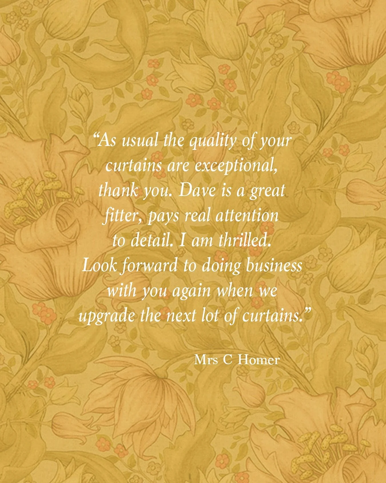 “Delighted with our lounge curtains Lesley. Wonderful fabrics to choose from and service from measuring windows to hanging curtains is first class. You obviously have an excellent team and would certainly come back.”