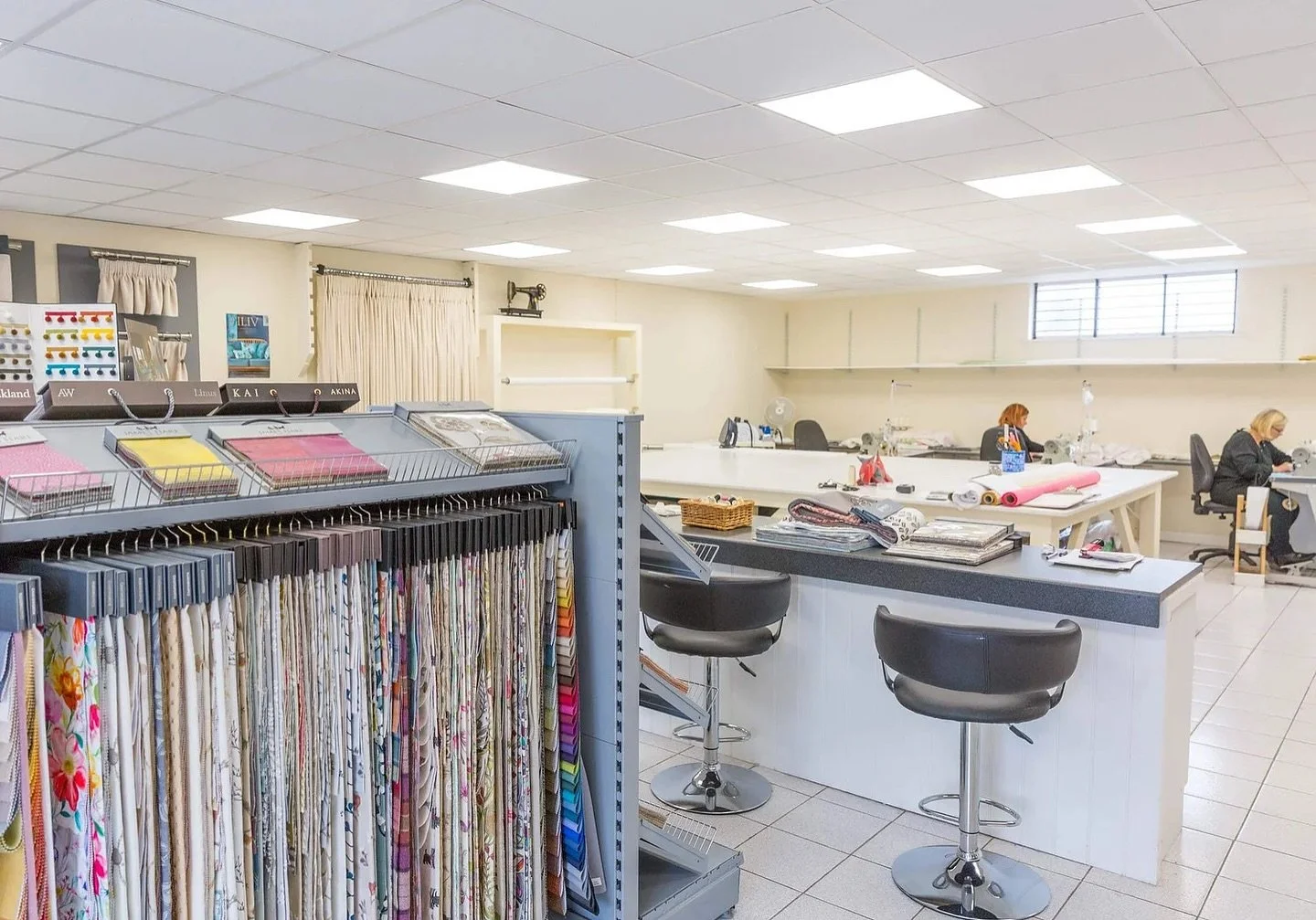 Lesley James offers a complete customer service and experience at her spacious open-plan showroom + workroom in the village of Penclawdd, Gower. Browse through an extensive range of fabrics in natural light, chat through individual requirements with friendly and knowledgeable staff, and see curtains and blinds being made to perfection.